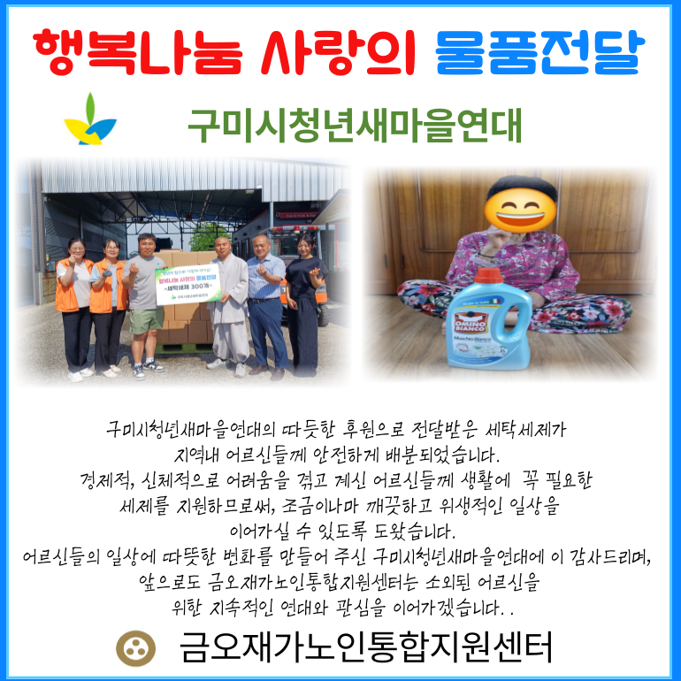 노인맞춤돌봄 구미시청년새마을연대 "행복나눔 사랑의 물품전달" 페이지 정보 작성자 관리자 댓글 0건 조회 583회 작성일 25-06-17 16:14 목록 본문 이전글LG전자노동조합 구미지부 '안심방역키트' 전달식 25.06.27 다음글6월 한화시스템 사랑의 나눔 전달식 25.06.17 댓글 0 댓글목록 등록된 댓글이 없습니다.