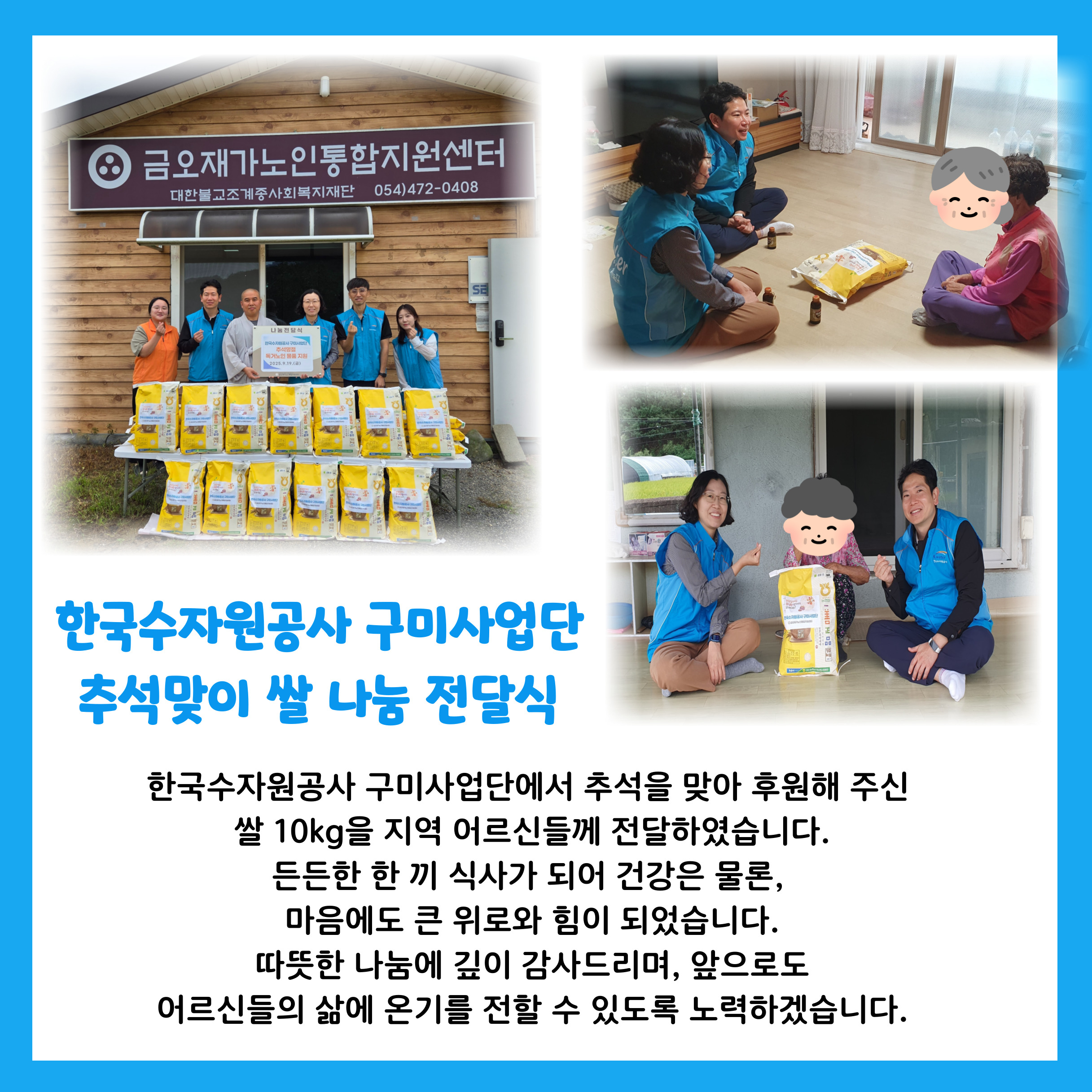 노인맞춤돌봄 한국수자원공사 추석맞이 쌀 나눔전달식 페이지 정보 작성자 관리자 댓글 0건 조회 92회 작성일 25-09-29 15:36 목록 본문 이전글신한라이프와 함께하는 사랑잇는전화 '행복나눔 키트 지원사업' 25.09.30 다음글#9월 20일 #구미사회복지사의날 '복지서비스전' 25.09.26 댓글 0 댓글목록 등록된 댓글이 없습니다.
