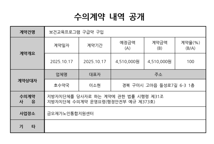 노인맞춤돌봄서비스사업 보건교육 프로그램 수의계약 내역 공개 페이지 정보 작성자 관리자 댓글 0건 조회 19회 작성일 25-10-20 11:34 목록 본문 노인맞춤돌봄서비스사업 보건교육 프로그램 수의계약 내역 다음글한국서부발전 후원 ‘복날맞이 삼계탕 나눔’ 구입 업체 선정 수의계약 내역 공개 25.07.24 댓글 0 댓글목록 등록된 댓글이 없습니다.