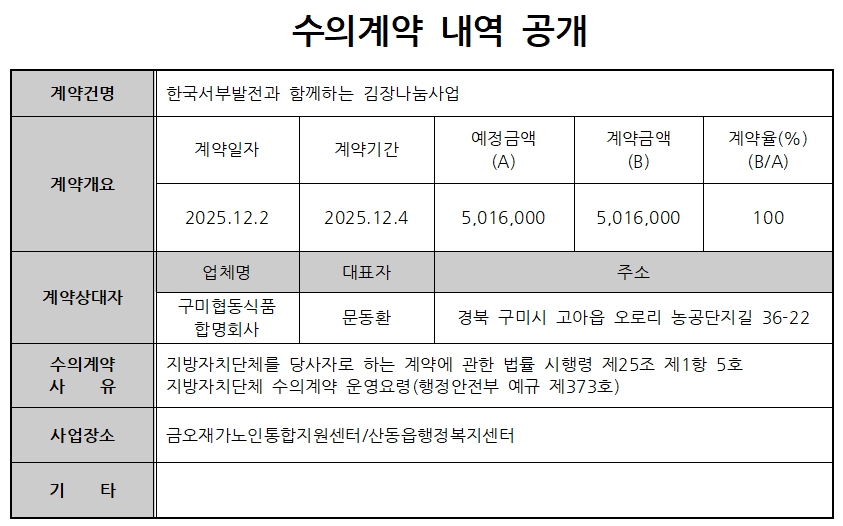 한국서부발전과 함께하는 김장나눔사업 수의계약 공고 내역 공개 페이지 정보 작성자 관리자 댓글 0건 조회 18회 작성일 25-12-02 17:36 목록 본문 한국서부발전과 함께하는 김장나눔사업 수의계약 공고 내역 공개 다음글노인맞춤돌봄서비스 2026년 수행인력 채용 공고 25.11.25 댓글 0 댓글목록 등록된 댓글이 없습니다.