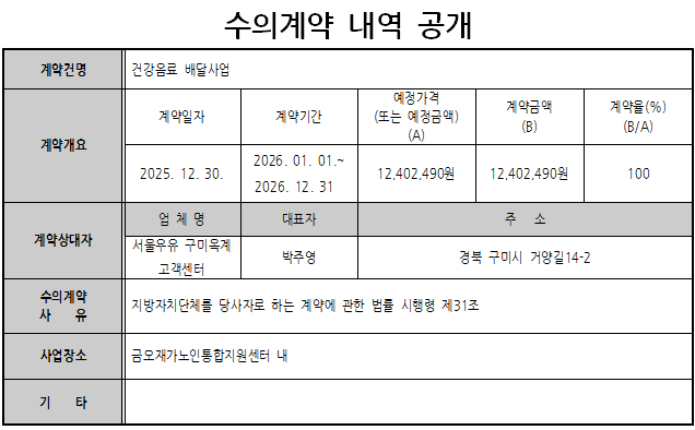 2026년 건강음료 배달사업 수의계약 내역 공고 페이지 정보 작성자 관리자 댓글 0건 조회 64회 작성일 25-12-30 13:40 목록 본문 건강음료 배달사업 수의계약 내역 이전글2026년 노인맞춤돌봄서비스 생활지원사 채용 공고 26.01.09 다음글노인맞춤돌봄서비스 2026년 수행인력 합격자 공고 25.12.17 댓글 0 댓글목록 등록된 댓글이 없습니다.