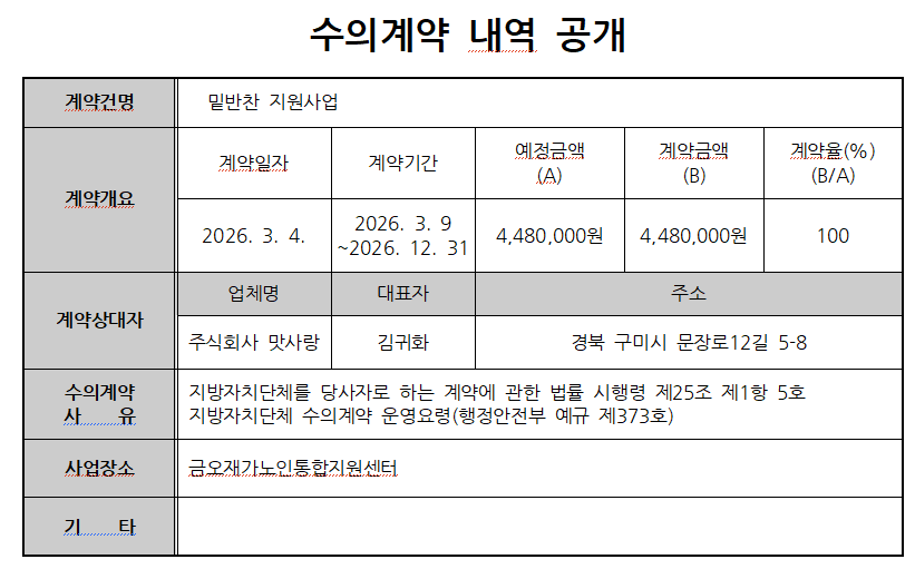 노인맞춤돌봄서비스 밑반찬 지원사업 수의계약 내역 공개 페이지 정보 작성자 관리자 댓글 0건 조회 82회 작성일 26-03-06 17:24 목록 본문 밑반찬 지원사업 수의계약 내역 이전글[긴급] 노인맞춤돌봄서비스 생활지원사 채용 공고 26.03.12 다음글밑반찬지원서비스 수의계약 내역 공개 26.02.25 댓글 0 댓글목록 등록된 댓글이 없습니다.